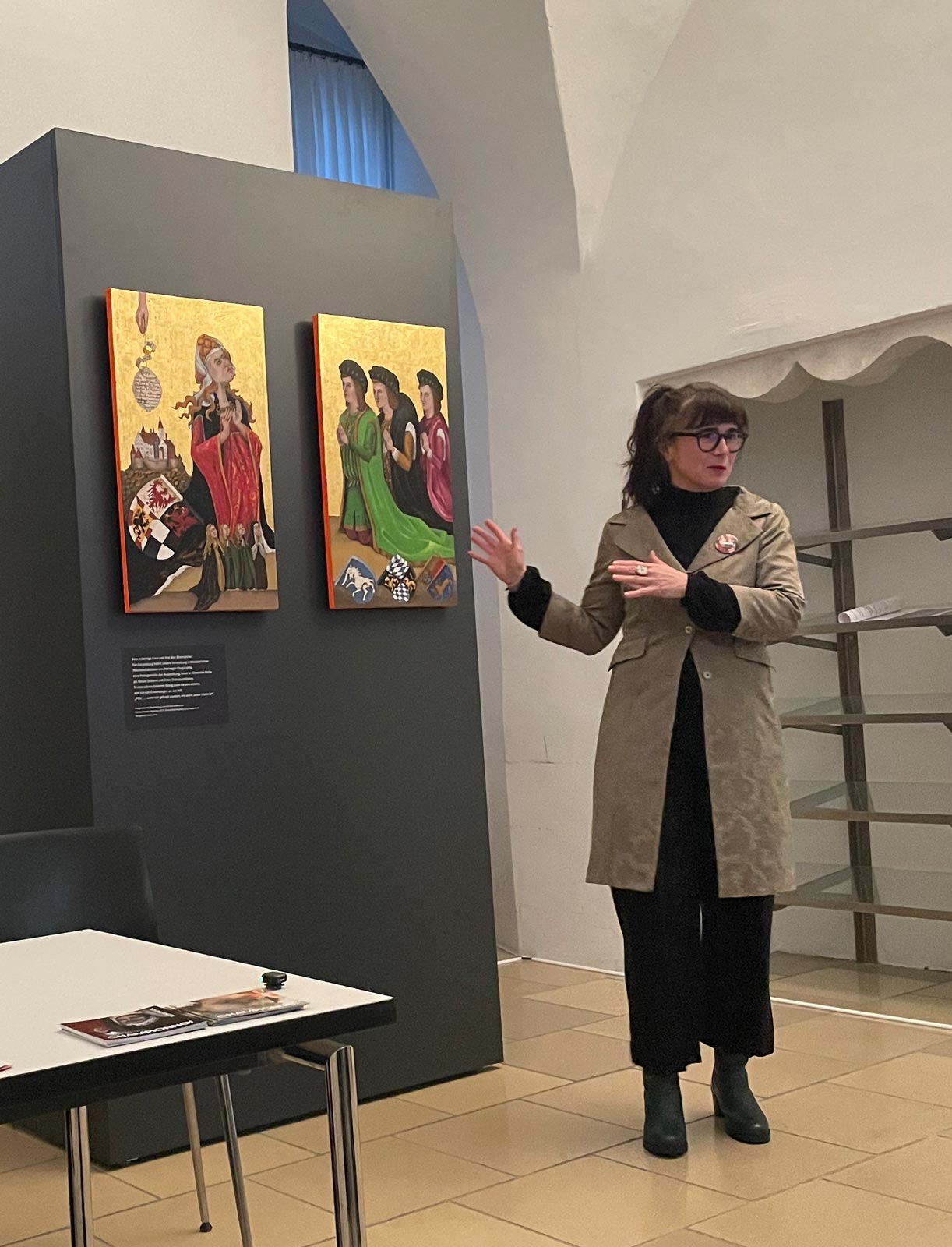Sehr gerne. Ich bringe eine ungewöhnliche Perspektive mit: die einer Künstlerin, die visuell arbeitet und sich gleichzeitig tief in historische Quellen einarbeitet. Das macht Gespräche lebendig und profunde — besonders in Kombination mit Wissenschaftlerinnen, Kuratorinnen oder Führungskräften.