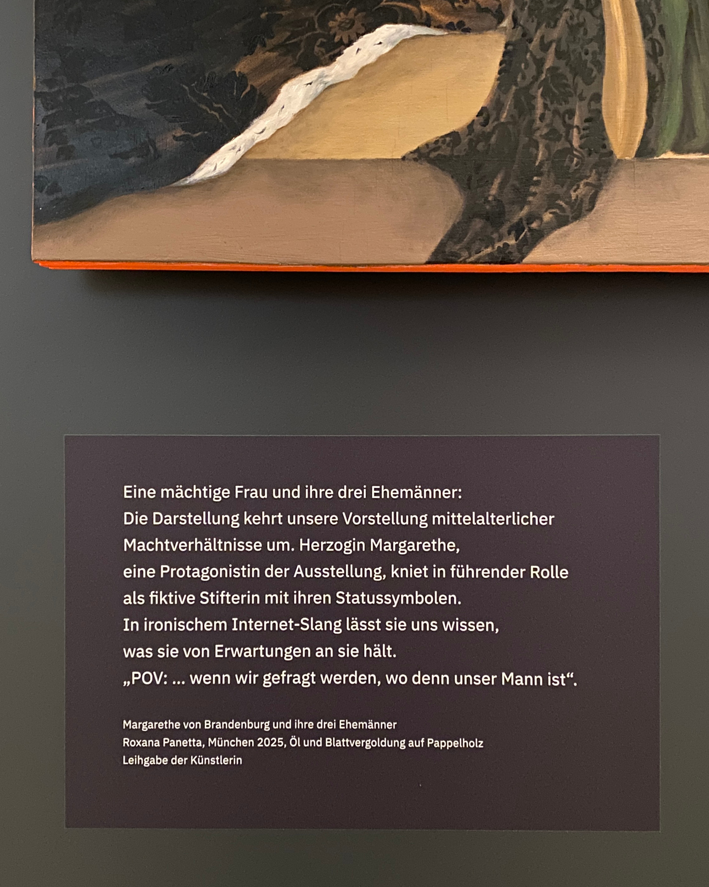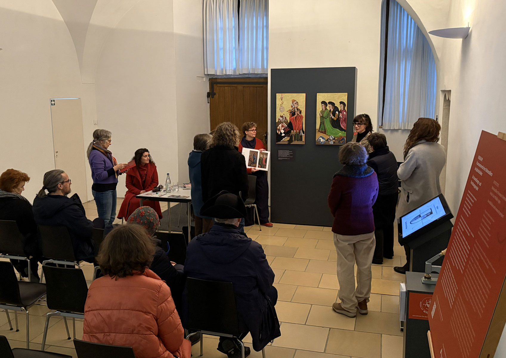 Anschließend führte Dr. Kohwagner-Nikolai in einer 45-minütigen Kurzführung durch die Sonderausstellung und machte Margarethes Leben und ihre Zeit für alle zugänglich. Danach stellte Roxana Panetta ihr fiktives Stifterbildnis von Margarethe von Brandenburg vor und erläuterte die versteckten Symbole und Erkennungszeichen, an denen man dieses Porträt als neuzeitlich erkennen kann.