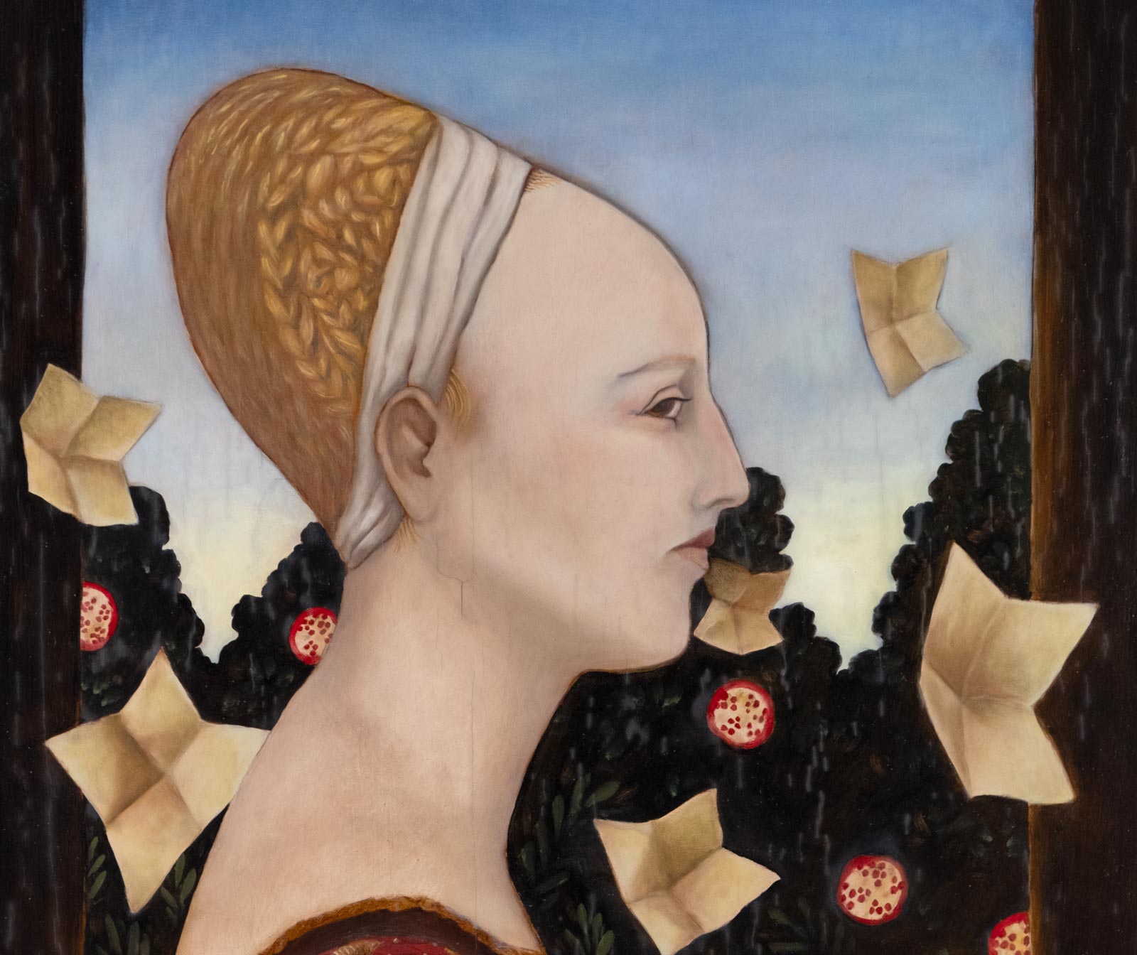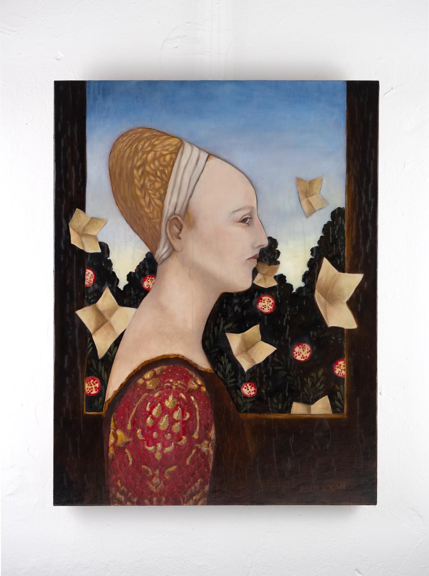 "Isotta Nogarola musste ihr Frausein aufgeben, um als Gelehrte im Kreis von Männern akzeptieren zu sein. In meinem Portrait von ihr zeige ich sie als potenzielle Braut, die nur in der Abgeschiedenheit einer Zelle frei sein kann." –Roxana Panetta