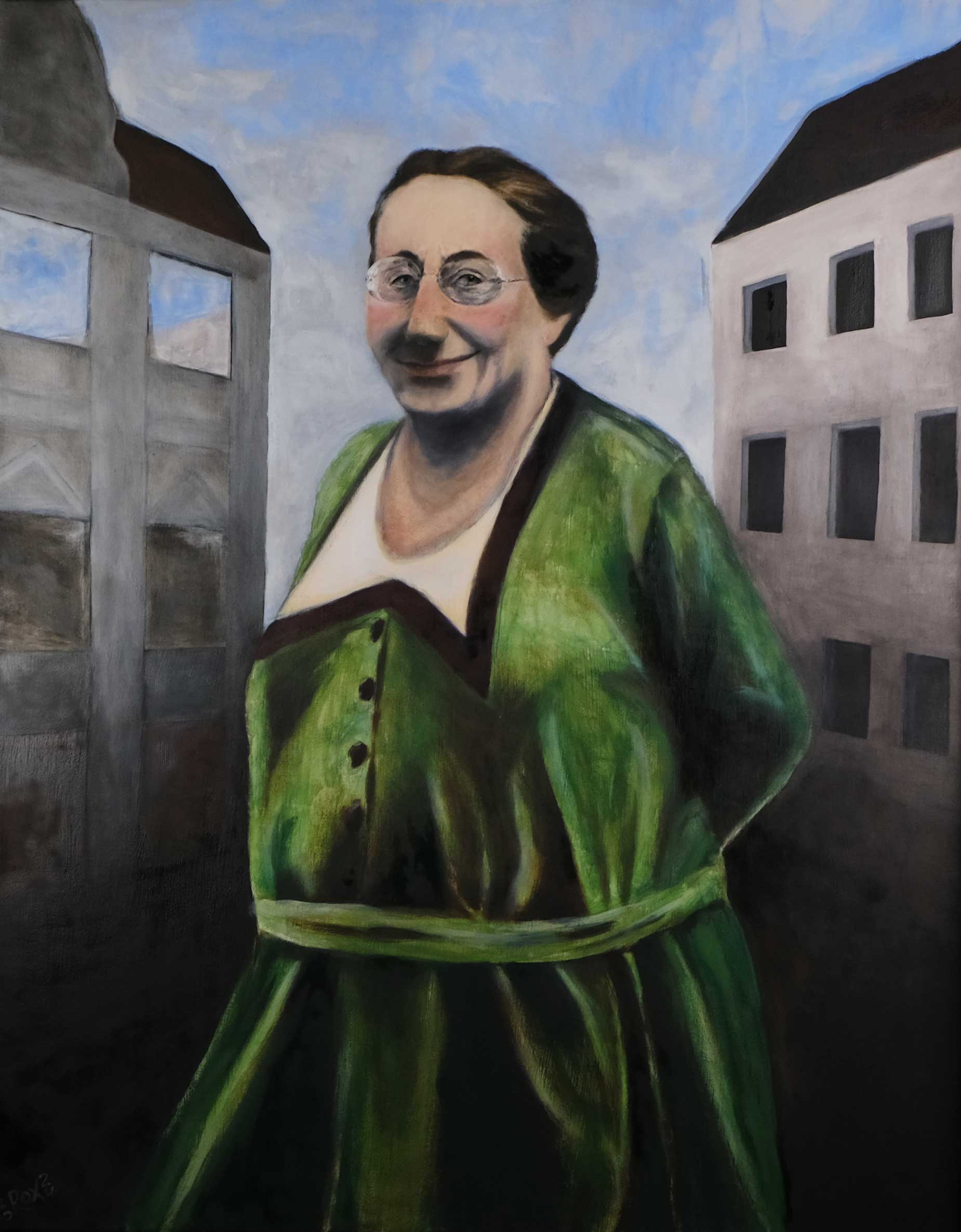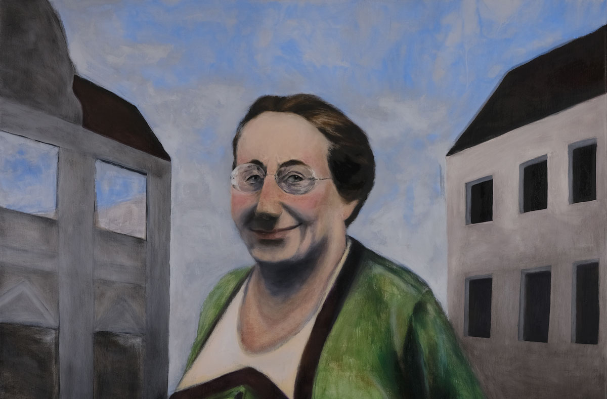 Die Stilistik der Neuen Sachlichkeit aufgreifend zeige ich Emmy Noether zwischen Kaiserreich und Moderne: links im Hintergrund ein Haus aus der Gründerzeit, rechts im Hintergrund die sachlich-reduzierte Architektur der 1920er Jahre. Sie steht dazwischen – ihre ganze Karriere und Anerkennung als Mathematikerin drohte von geltenden, rigiden Vorschriften (Habilitationsverbot für Frauen in Preußen) und der allgemein vorherrschenden Frauenfeindlichkeit zerrieben zu werden. Doch Emmy Noether steht wie Fels unerschütterlich zwischen diesen politischen Welten und verfolgt fröhlichen Gemüts ihre Liebe zur Mathematik.