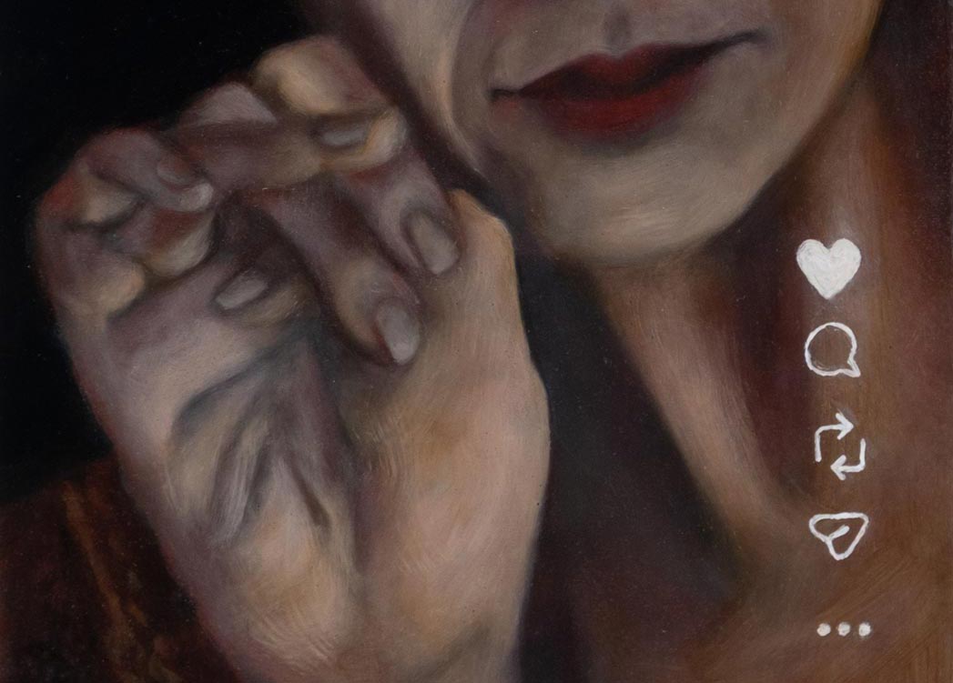 In the portrait she makes a hand gesture that victims of violence use when they can be seen but not heard – a signal that emerged 500 years later.